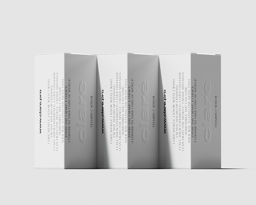 Мы хотели сделать Claré яркой, сильной и в то же время изысканной и женственной. И мы показали это во всём: в съёмке, где мы сочетаем яркие, цветные и спокойные чёрно-белые фото, показывая, что Claré — это про разные эмоции, выбор, использование декоративной косметики как творческого инструмента, а не попытки скрыть своё лицо; в типографии, соединяя очень контрастные шрифты,; в цветах, используя ярко-красный и синий цвета, подобные вспышкам на монохромном фоне.